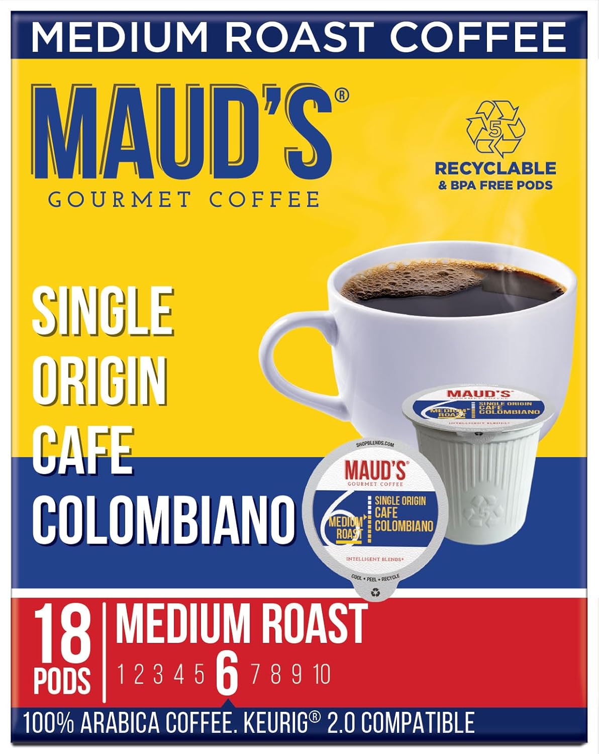 Maud’s Columbian Coffee Pods, 18 ct, Single Origin, Medium Roast Coffee in Recyclable Single Serve Pods – 100% Arabica Coffee, Compatible with Keurig K Cups Maker