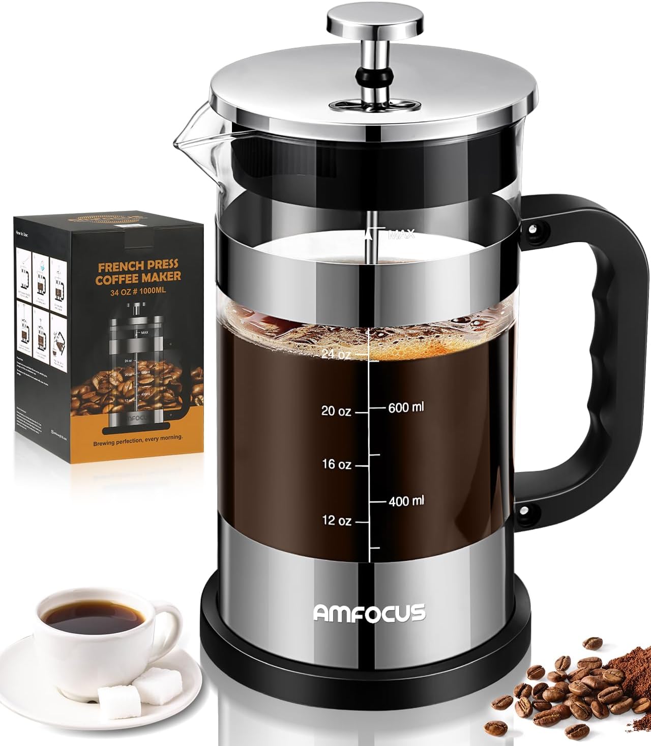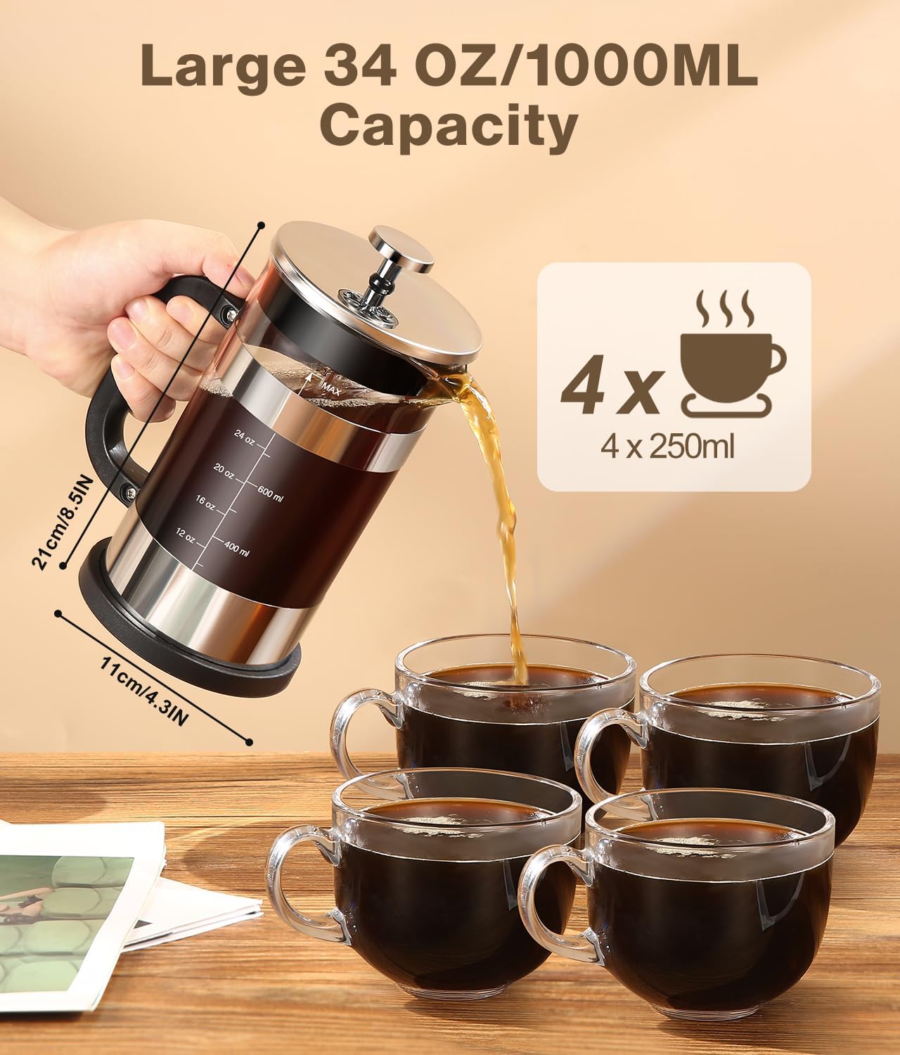 【EASY TO USE】 Brew a cup of coffee in minutes. The 34oz/1000ml French Press makes the perfect cup of coffee. The French coffee press is the easiest to concentrate on the condition of the beans among the many devices. You can see the amount of foam (crema) after the coffee touches the water, and how the coffee floats on the water and slowly sinks