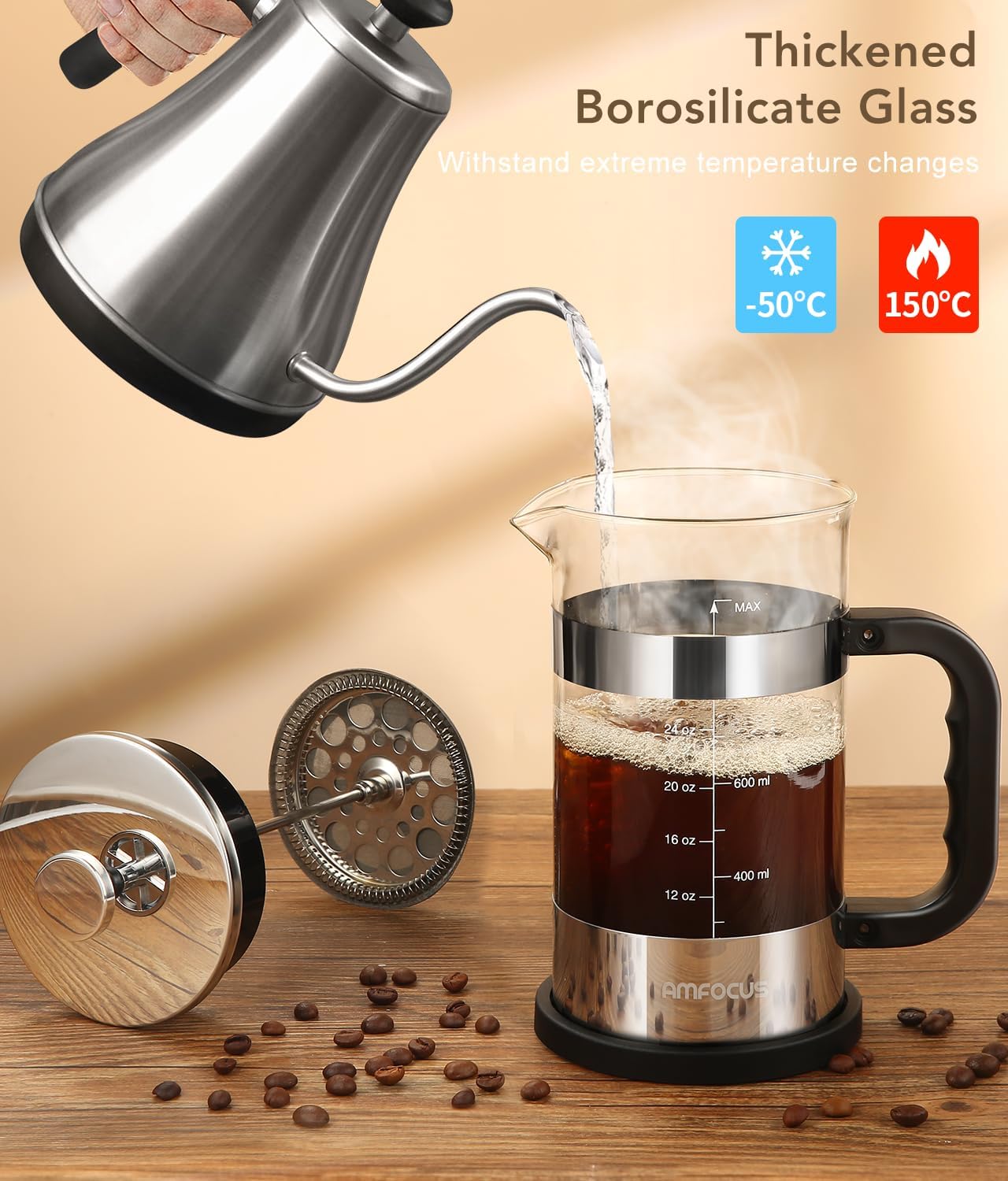【DURABLE COFFEE MAKER】French press coffee maker is made of thickened borosilicate glass, with top quality 304 stainless steel and BPA-free plastic,can withstand high temperatures to ensure rust prevention, corrosion prevention, and anti-deformation, making it durable and long-lasting. The transparency glass beaker allows you to monitor the whole procedure of making your coffee, adding a touch of sophistication to your morning routine