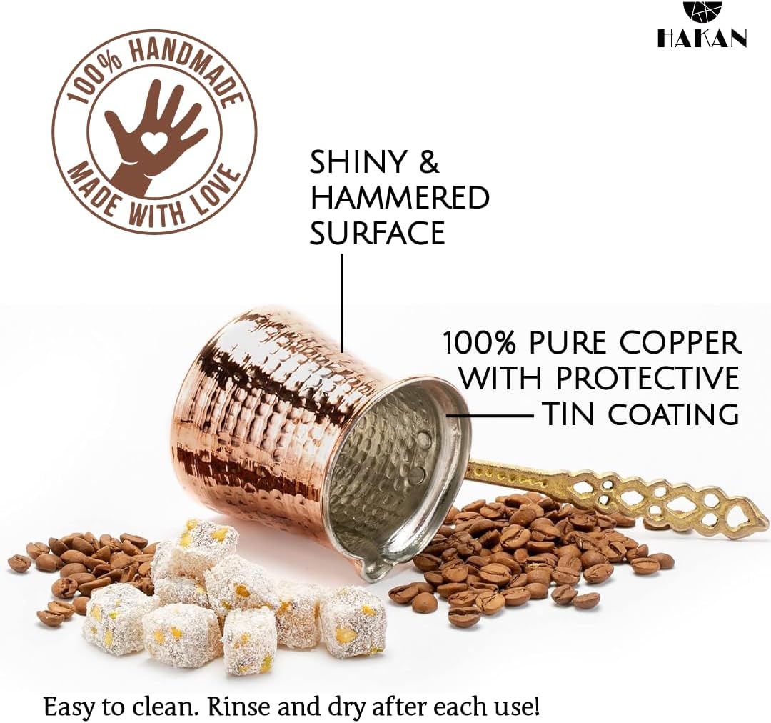 HAKAN Turkish COFFEE POT: It is made of pure COPPER with a hammered surface, brass handle, and HANDMADE design. The copper coffee pot is of high quality with its original structure. The copper jazva is sturdy and durable. It has a drip-free, great pouring spout.