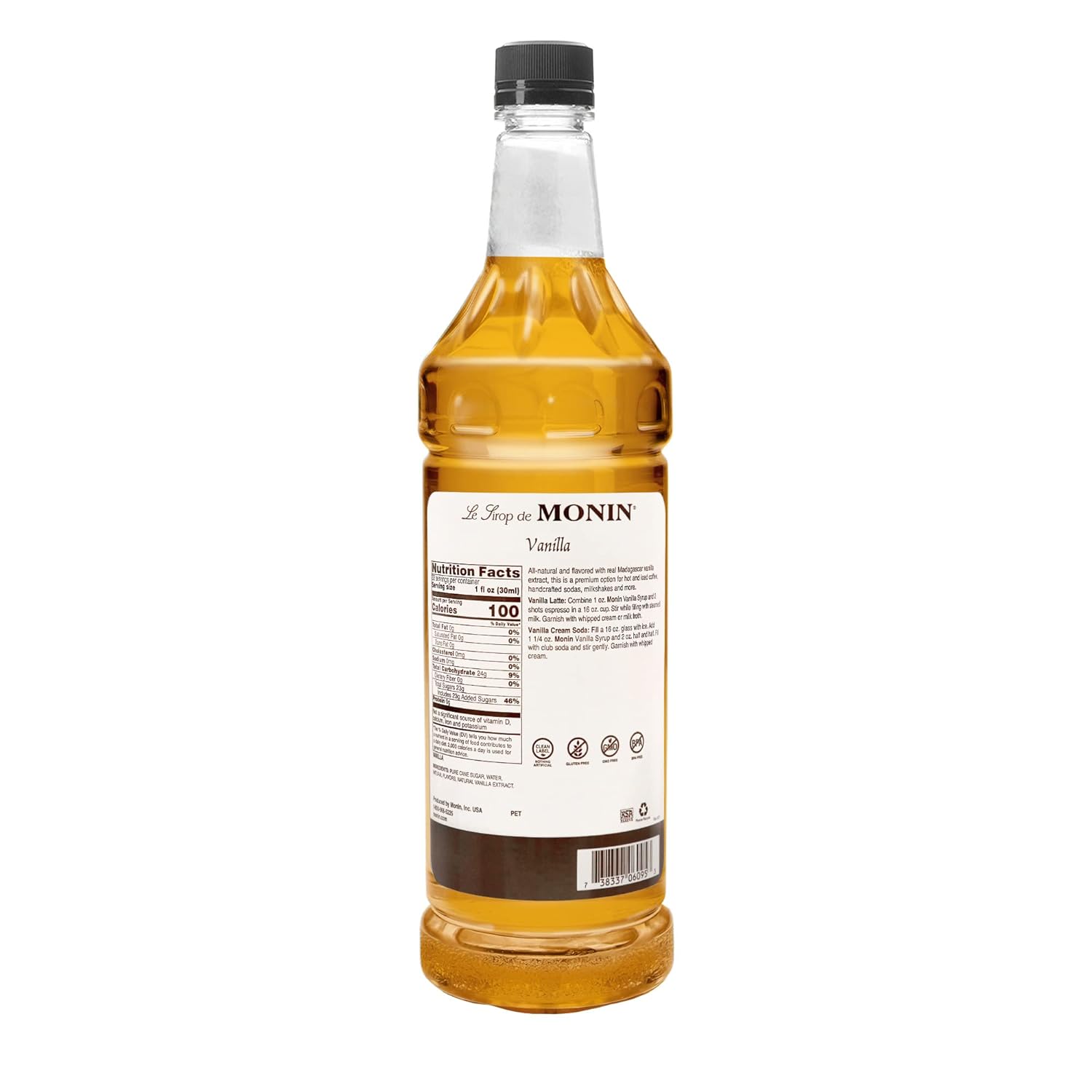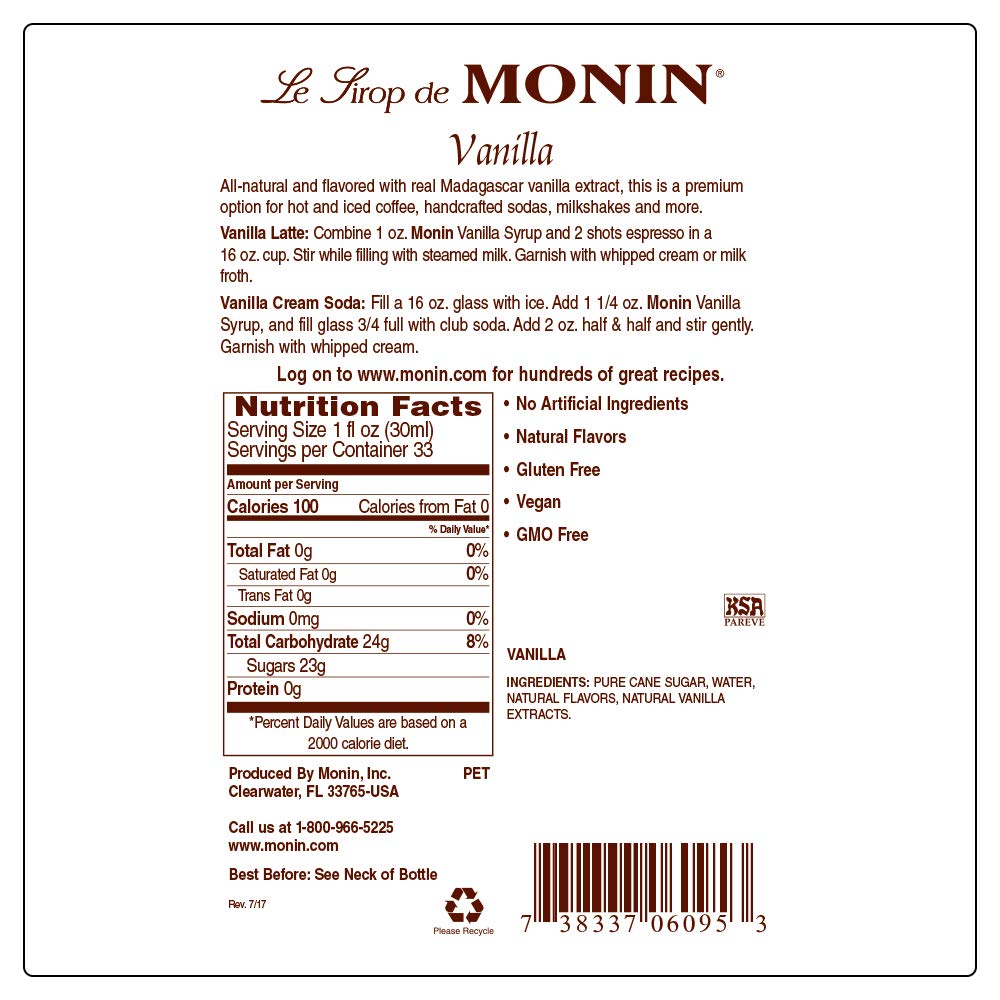 Using pure Madagascar vanilla ensures that our Vanilla Syrup will bring high-quality, rich flavor to drinks and desserts. This popular, versatile flavor brings smooth warmth to beverages of every kind. Monin Vanilla Syrup adds rich, smooth flavor to lattes, mochas, smoothies, shakes, specialty cocktails or even whipped cream. Distinctive and sweet vanilla extract aroma, smooth, custard-like vanilla flavor derived from select Madagascar vanilla beans. Our Vanilla syrups are always allergen-free, dairy-free, gluten-free, Halal, Kosher, contains no artificial colors, no artificial flavors, no artificial ingredients, no artificial preservatives, no artificial sweeteners, and non-GMO.