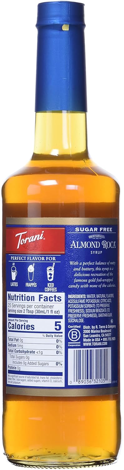 Torani Coffee Syrup, Sugar free Almond Roca Flavored Syrup for Drinks 25.4 oz