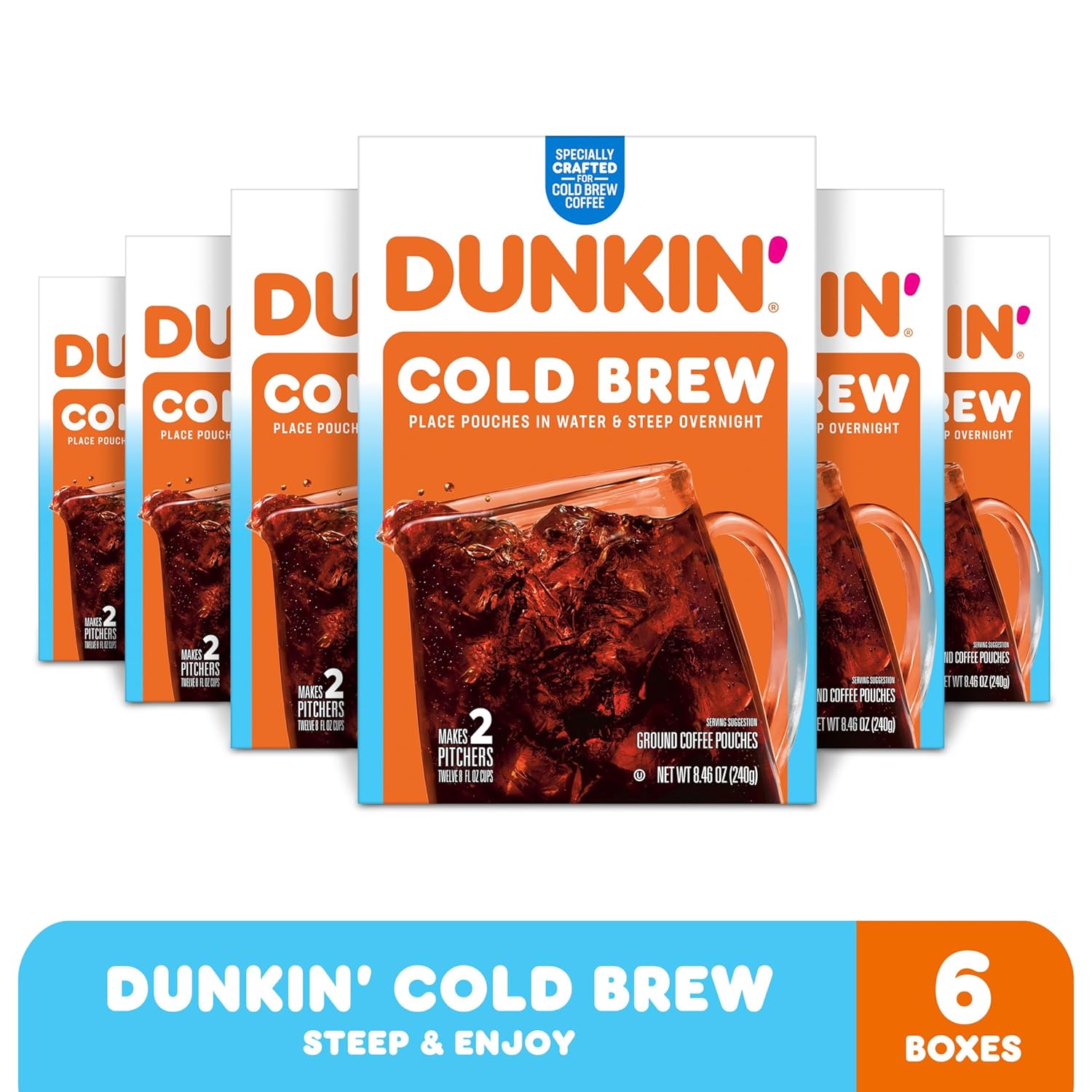 CONTAINS: 6 boxes of 4 Dunkin’ Cold Brew Ground Coffee Pouches (24 total pouches)