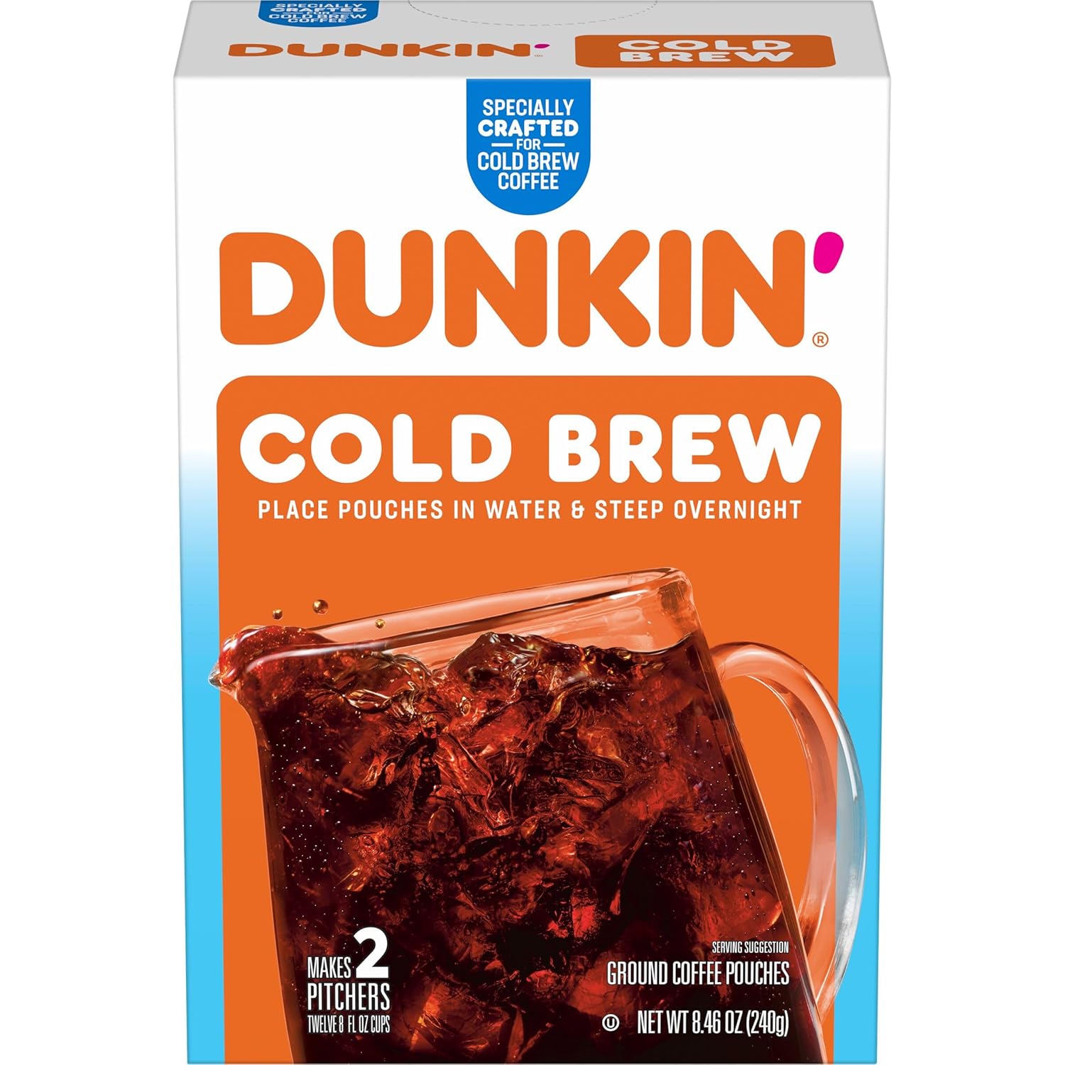 Grab a pitcher and get cold brew coffee right from your refrigerator with Dunkin’ Cold Brew coffee pouches. It’s easy — just drop two coffee pouches into four cups of cold water and let them steep in your fridge overnight (8-12 hours). Then, remove the pouches and add three cups of cold water, or as much as you need to achieve your desired brew strength. All that’s left is to add ice and enjoy your cold brew for up to a week. Pour it straight from the pitcher and drink it as-is or customize it with your favorite creamer and sweetener. Either way, that bold Dunkin’ taste is just a few steps away.