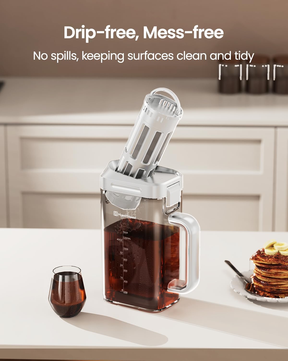 Maestri House Compact Cold Brew Coffee Maker, 41oz Iced Tea and Coffee Maker Brewer Space Saving Tritan Pitcher, 350 Mesh Filter, 100% Leak-Proof (White)